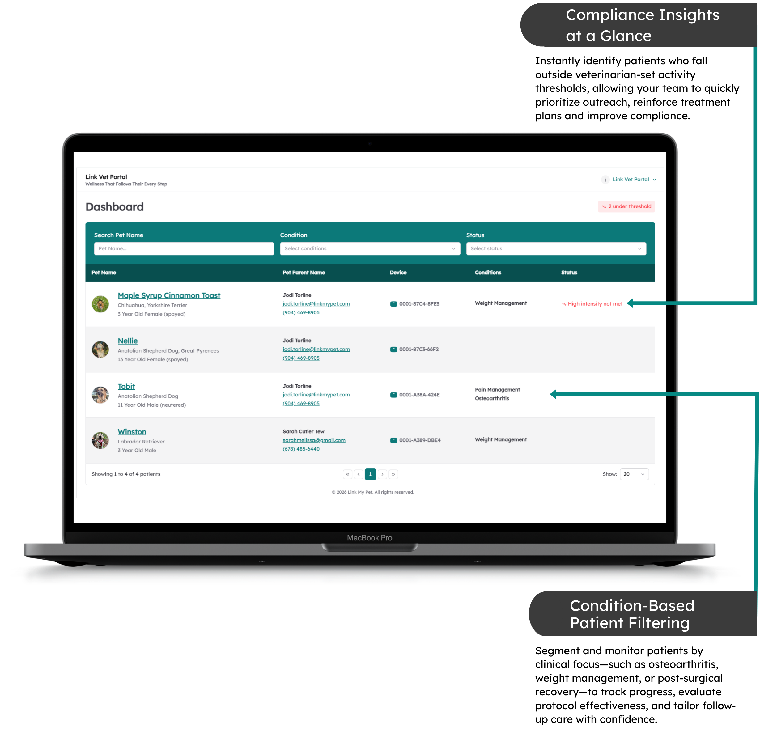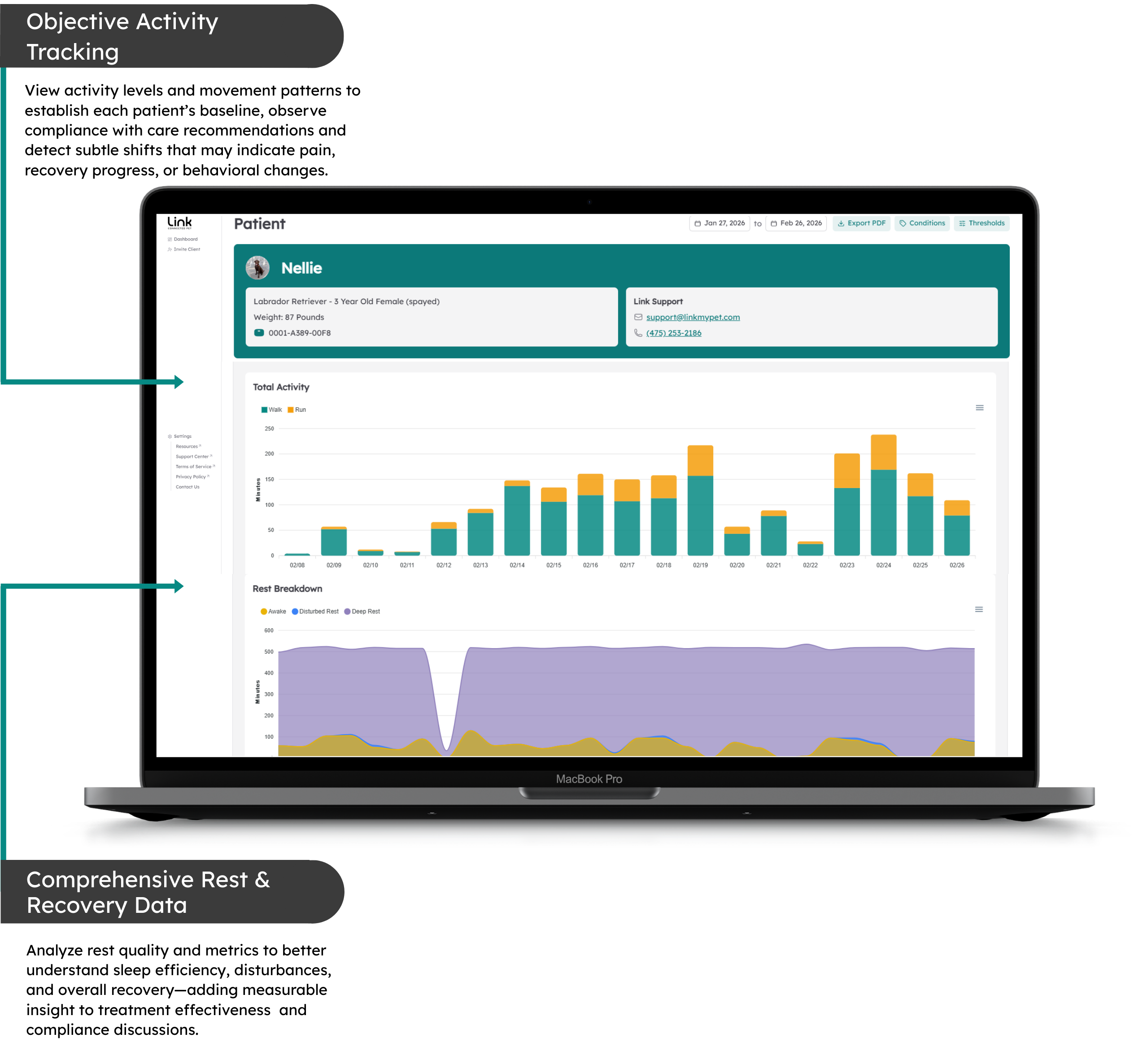 The LinkVet Portal transforms passive monitoring into proactive care by delivering objective, continuous activity and rest data directly to your team. With actionable compliance insights, condition-based filtering, and patient-level trend analysis, veterinarians can detect subtle changer earlier, reinforce treatment plans with measurable data, and strengthen client accountability. The result is more informed decision-making, improved outcomes and deeper client trust without disrupting clinical workflow.